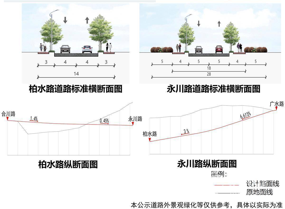 据了解,规划永川路(广水路至柏水路段)、柏水路(合川路至永川路段)均为城市支路,永川路(广水路至柏水路段)道路红线宽度为18米,两侧各5米宽绿化带;柏水路(合川路至永川路段)道路红线宽度为14米。(信网记者)