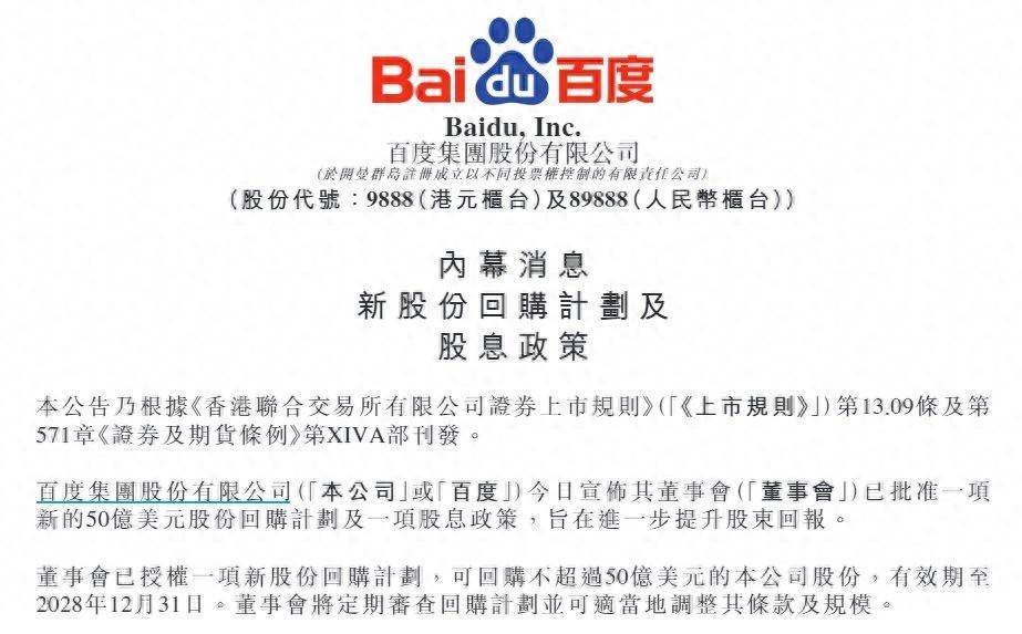 根据百度公告,根据新股份回购计划,公司可回购不超过50亿美元的普通股,有效期至2028年12月31日。